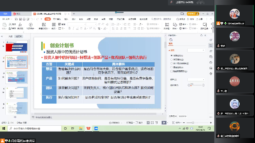 会议最后,学院创新创业骨干教师闫彩霞结合前期各项目指导情况,与参会师生就如何写好一份创业计划书进行了交流。闫老师从投资者的角度,对一份优秀的计划书进行了深度的剖析与分段指导。重点讲述了一个好项目应具备的四个条件:好想法+创新产品+优秀团队+强有执行力。通过深入交流使参会师生对大赛规则、评审标准有了明确的认识,为后续参赛奠定了良好的基础。