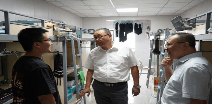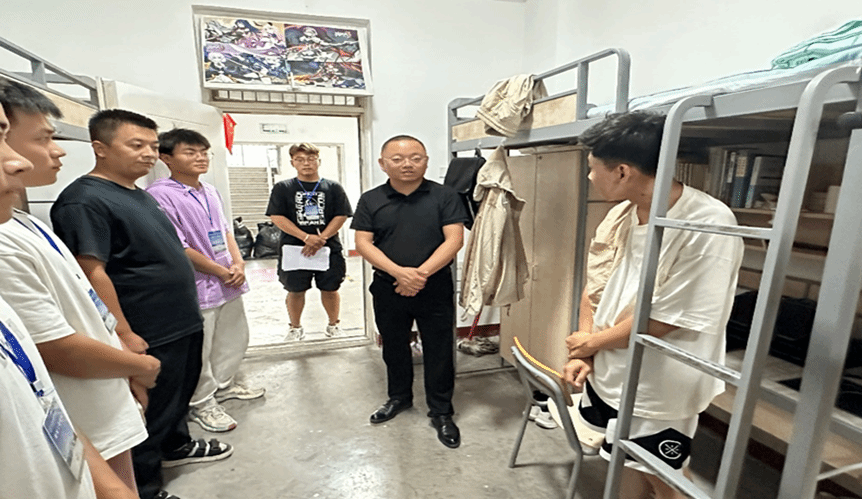 党委第二负责人(专职)郝彦荣、辅导员左海明深入5号男生公寓,他要求学生们要增强安全防范意识,主动预防电信诈骗,确保学生百分之百安装“金钟罩”手机APP,宿舍长发现“苗头”性问题要及时上报辅导员,严禁校外住宿,未经请假不得夜不归宿。对暑期遭遇极端天气灾害的受灾家庭学生摸底,动员学生积极申报临时性困难补助,并鼓励学生加强体育锻炼,养成良好作息习惯。