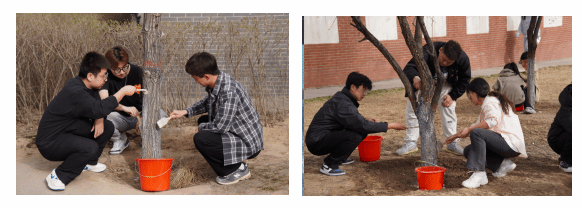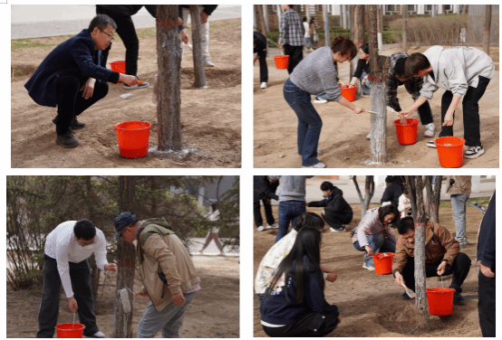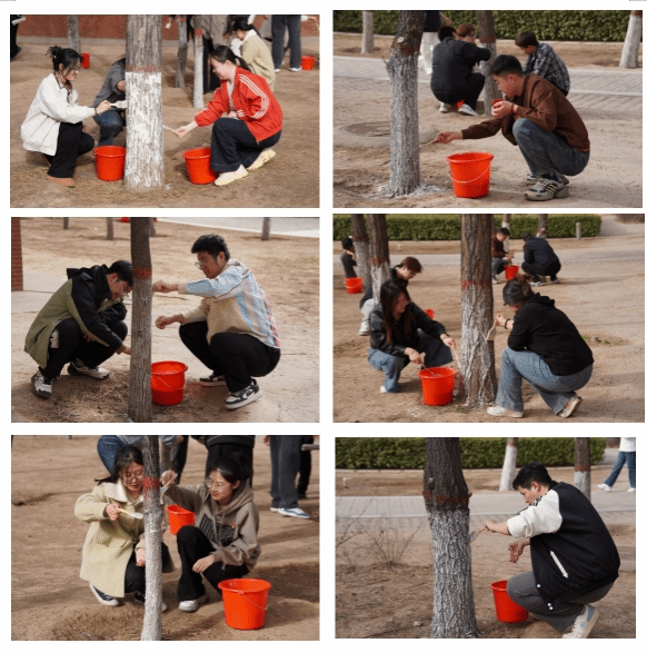 此次党日活动的主要任务是对校园树木进行树干刷白。党员同志们按照区域分工安排,各司其职,手提水桶、手持刷子,从树干底部,自下而上,有条不紊地涂抹着,针对树皮缝隙、洞孔等特殊部位,更是反复涂刷,确保养护工作细致入微。在大家的共同努力下,百余棵树木焕然一新,整齐划一的“白色新衣”为校园增添了一道亮丽风景线,以“志愿红”点染“生态绿”,充分展现出师生党员昂扬向上的精神风貌。