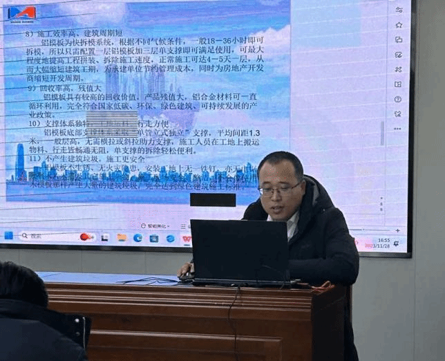 随后,王正伟对铝合金模板系统作专题讲座,科技公司经理郭晓军从铝合金模板系统介绍、铝合金模板安装、铝合金模板拆除、铝合金模板工程注意事项、铝合金模板实例照片这五个章节对铝合金模板系统、设计进行了详细讲解。