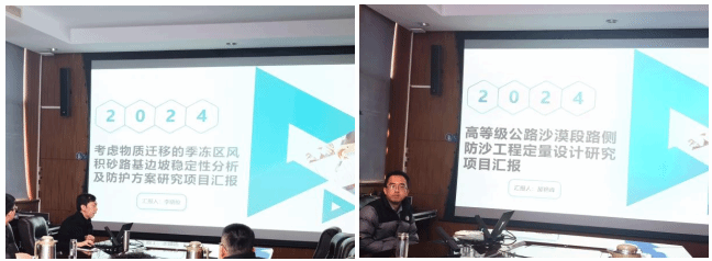 随后,针对山西四建“内蒙古自治区柴登至图克一级公路项目”,我院正高工李晓俊围绕“考虑物质迁移的季冻区风积砂路基边坡稳定性分析及防护方案研究”、“交通重载作用下强风化区风积砂路基结构衰变致灾机制及综合防治方法研究”,博士郝艳峰围绕“高等级公路沙漠段路侧防砂工程定量设计研究”进行了拟研究项目汇报。双方就项目的可行性、技术研发难点、未来应用前景等进行了深入交流。