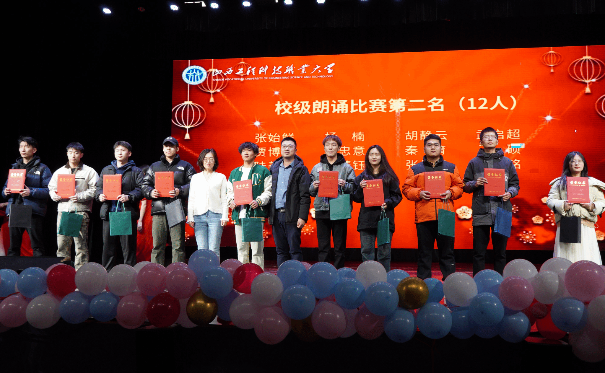 第二轮校级文体活动竞赛奖由学院综合办主任尹晓娟老师、教产研负责人贾超老师,为获得“校级男子篮球比赛”第三名、“校级男子足球联赛”第二名、校运会男子4×400米接力第一名、女子4×100米接力第二名、男子铅球第一名、男子跳远第三名、“校级朗诵比赛”第二名、男子400米破校纪录的同学颁奖。
