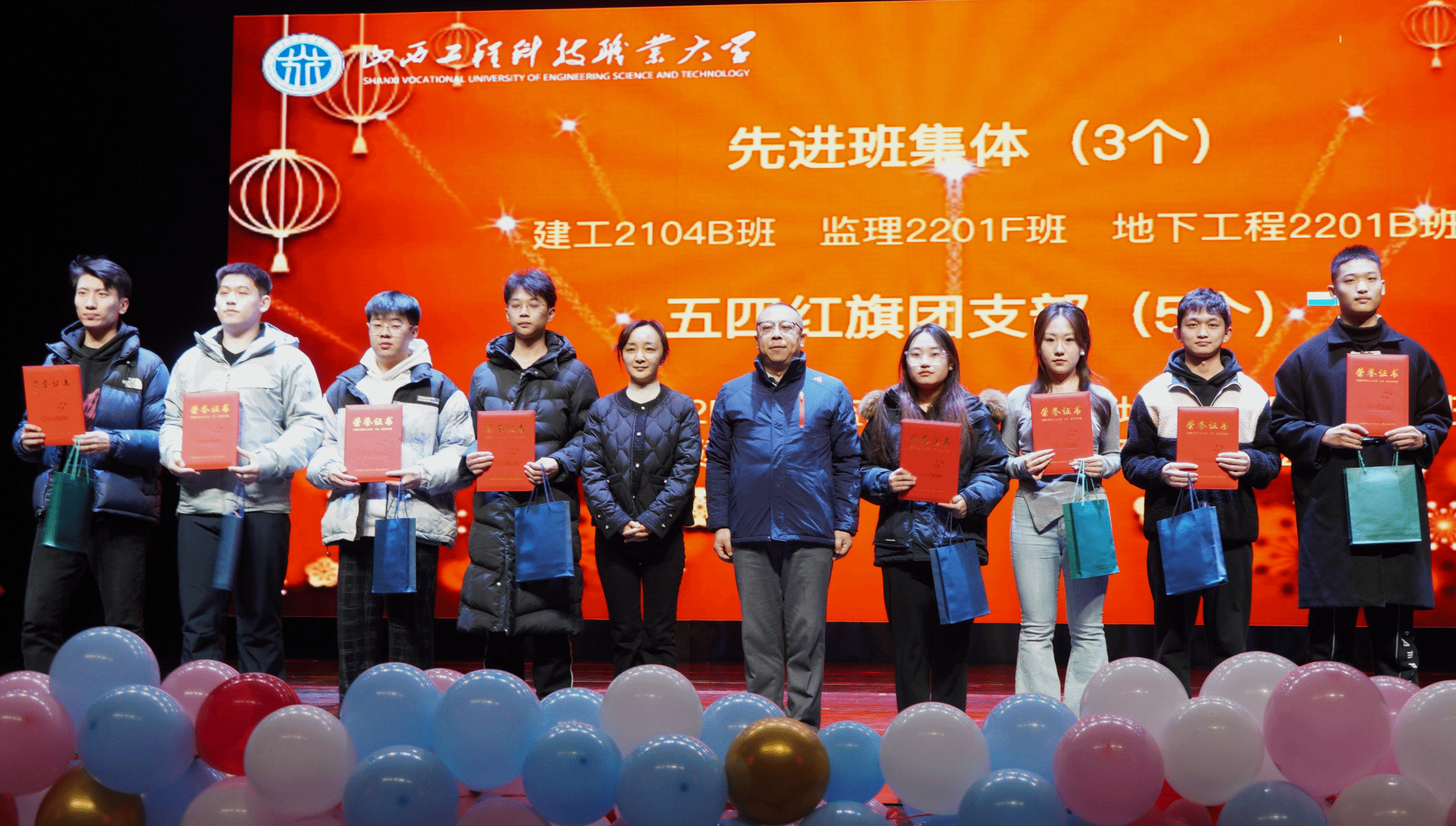 第一轮校级集体荣誉奖由学院学工办主任武雅蓉老师,团委书记王宝栋老师为获得“先进班集体”和“五四红旗团支部”的班级颁奖。
