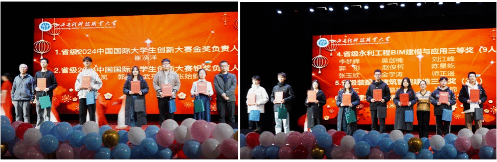 第三轮省级以上学术竞赛奖由智能建造系主任刘炜老师和基础部主任李显辉老师为获得“国家级水利工程BIM建模与应用大赛三等奖”、“省级2024中国国际大学生创新大赛金奖”、“省级2024中国国际大学生创新大赛银奖”的同学颁奖;由学院副院长郭庆阳老师为建筑工程识图获得省赛一等奖、省赛三等奖、建设工程数字化计量与计价省赛三等奖、水利工程BIM建模与应用省级三等奖、装配式建筑智能建造省级三等奖、建筑信息模型应用省级三等奖的同学颁奖。