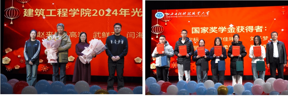 第四轮由学生代表江梓轩、梁存昕上台为建工学院2024年光荣退休的教师代表赵来彬、高岩两位老师献花,赵来彬老师代表退休教师寄语建工学子,珍惜韶华、夯实基本功、提升专业技能,为社会作出贡献;学院党委副书记赵晓通老师为本年度获得“国家奖学金”的6名同学颁奖。