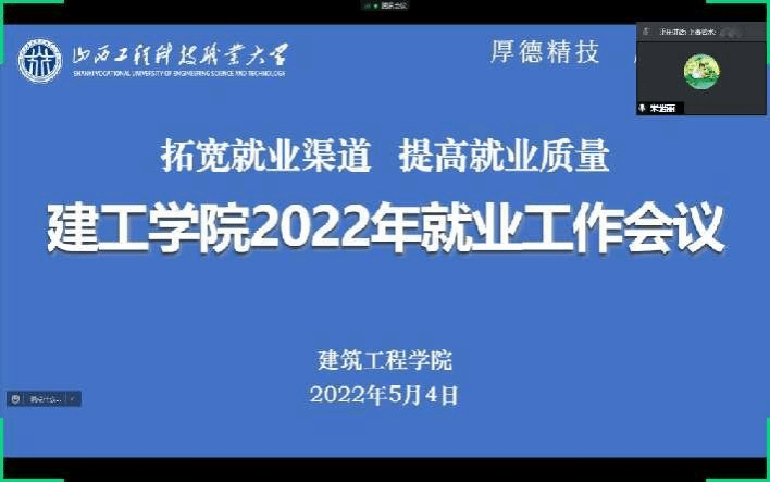 扎实开展2022届毕业生就业服务工作进一步落实拓宽就业渠道,提高就业质量工作要求,5月4日下午,欧洲熟妇的性久久久久久组织召开2022年就业工作会议。本次会议疫情影响采用线上会议举行。建工学院全体领导、三系一部负责人、三办一中心负责人、团委负责人、2022届毕业班班主任及产教研办公室全体老师参加了本次会议会议由学院教学行政第二负责人申海洋主持。