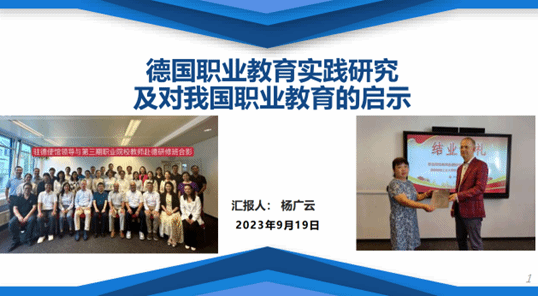 杨广云老师于2023年6月2日—2023年8月29日,赴德国德累斯顿工业大学职业教育与继续教育学院,进行为期3个月的研修访学。本次研修内容为以“双元制”为主导的德国职业教育体系及相关教育理论、质量管理、课程开发等内容。研修形式包括理论学习、参观学习和主题讨论。全院教师认真聆听了杨老师的汇报,并进行了积极热烈的互动交流研讨。