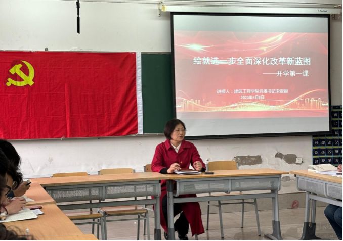 4月8日下午3:00,学院党委书记宋岩丽以“绘就进一步全面深化改革新蓝图”为主题,结合学院实际、学生个人发展,向全院学生党员讲授“开学第一课”。