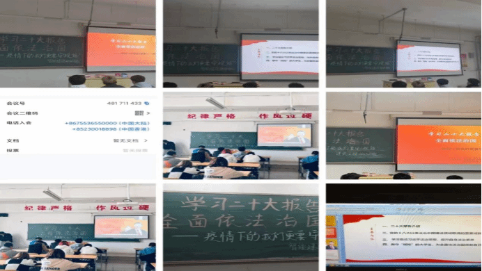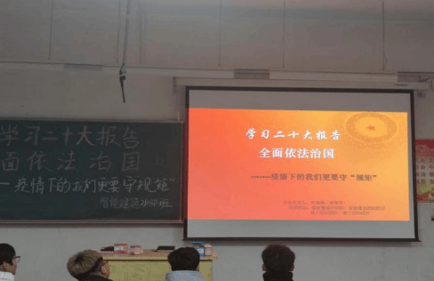 2022年11月26日下午15点至16点30分张娟娟老师组织智能建造2103D、2203D、班,建工2203Z、2204Z班召开了题为:学习二十大报告 全面依法治国----疫情下的我们更要守“规矩”主题班会。会议采取线上线下相结合的方式并运用多媒体投屏的方式召开。