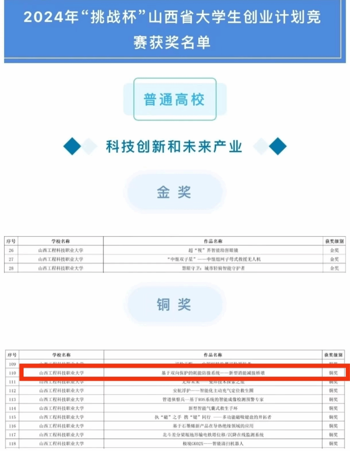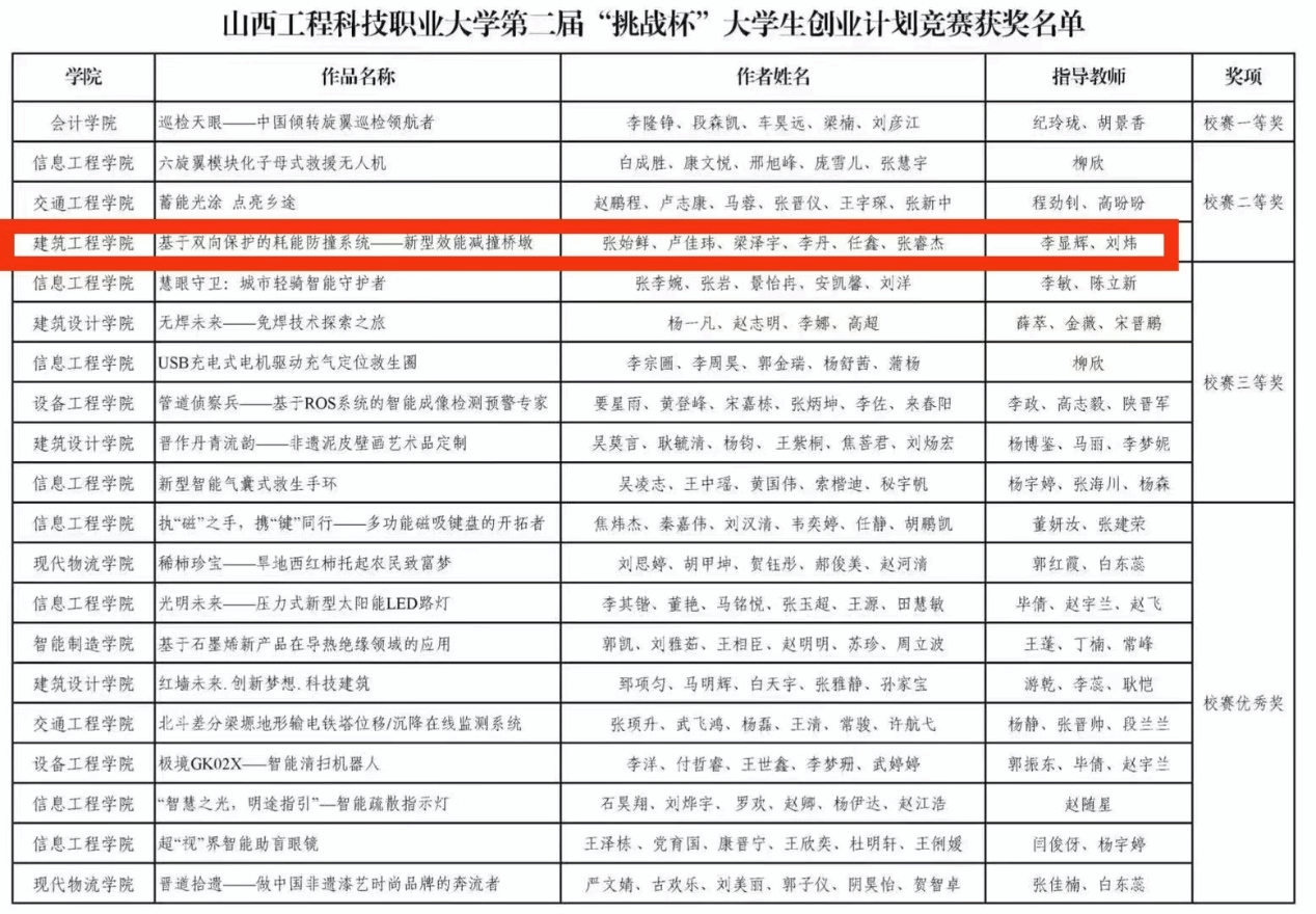 我院在刚刚结束的2024年“挑战杯”山西省大学生创业计划大赛中,由李显辉老师指导的《基于双向保护的耗能防撞系统——新型消能减撞桥墩》荣获校二等奖1项、省铜奖1项,再次创造了我院在该项赛事中的优异成绩。