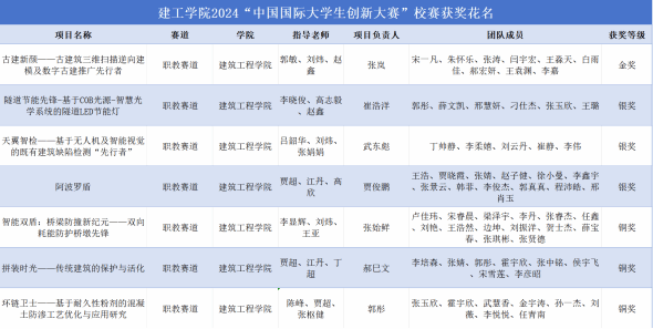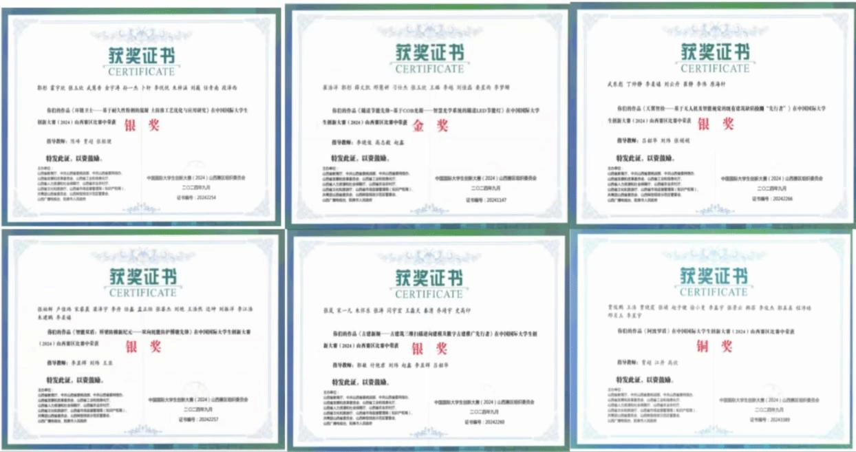 之后获奖师生从“人有我优”的角度出发,利用自己所学的专业知识解决社会难题,针对痛点难点提出策略建议,开展创新型创业实践,把握核心优势,以高标准、严要求打磨项目。在2024 年 7 月 29 日的山西省“中国国际大学生创新大赛”中取得了优异的成绩。由崔浩洋负责的《隧道节能先锋——基于COB光源-智慧光学系统的隧道LED节能灯》获省赛金奖;由张始鲜负责的《智能双盾:桥梁防撞新纪元——双向耗能防护桥墩先锋》获省赛银奖;由武东彪负责的《天翼智检——基于无人机及智能视觉的既有建筑缺陷检测“先行者 ”》获省赛银奖;由张岚负责的《古建新颜——古建筑三维扫描逆向建模及数字古建推广先行者》获省赛银奖;由郭彤负责的《环链卫士——基于耐久性粉剂的混凝 土防渗工艺优化与应用研究》获省赛银奖。由贾俊鹏负责的《阿波罗多》获省赛铜奖。