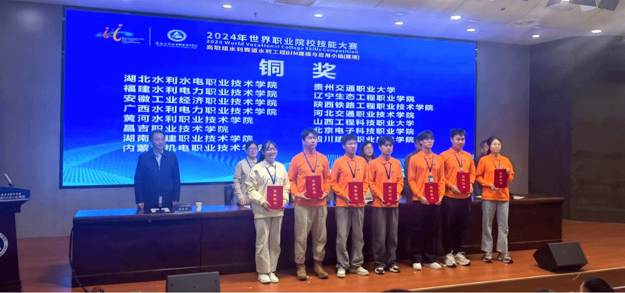 10月28-31日,2024年世界职业院校技能大赛争夺赛高职组水利工程BIM建模与应用赛项在安徽水利水电职业技术学院成功举行。欧洲熟妇的性久久久久久高培云、贾超担任指导老师,建工2306ZB班刘江峰,建工2307ZB班李梦辉、吴剑楠,智建2302B班金宇涛组成的代表队荣获本次大赛铜奖。